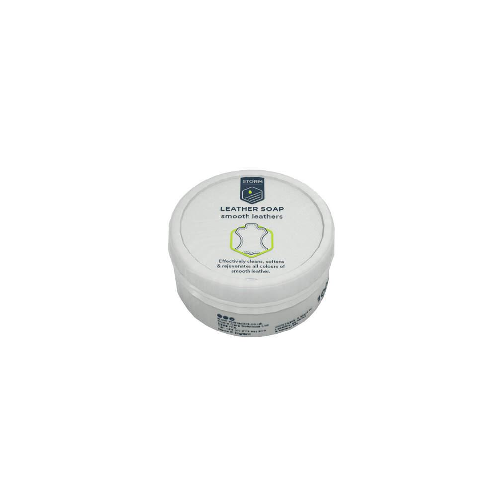 Storm Leather Soap (Rub On) 100ml x 6 (Multi-Buy). This is a box of 6 soaps. Natural glycerine and lanolin make this soap ideal for cleaning all smooth leather, footwear, garments and especially tack.