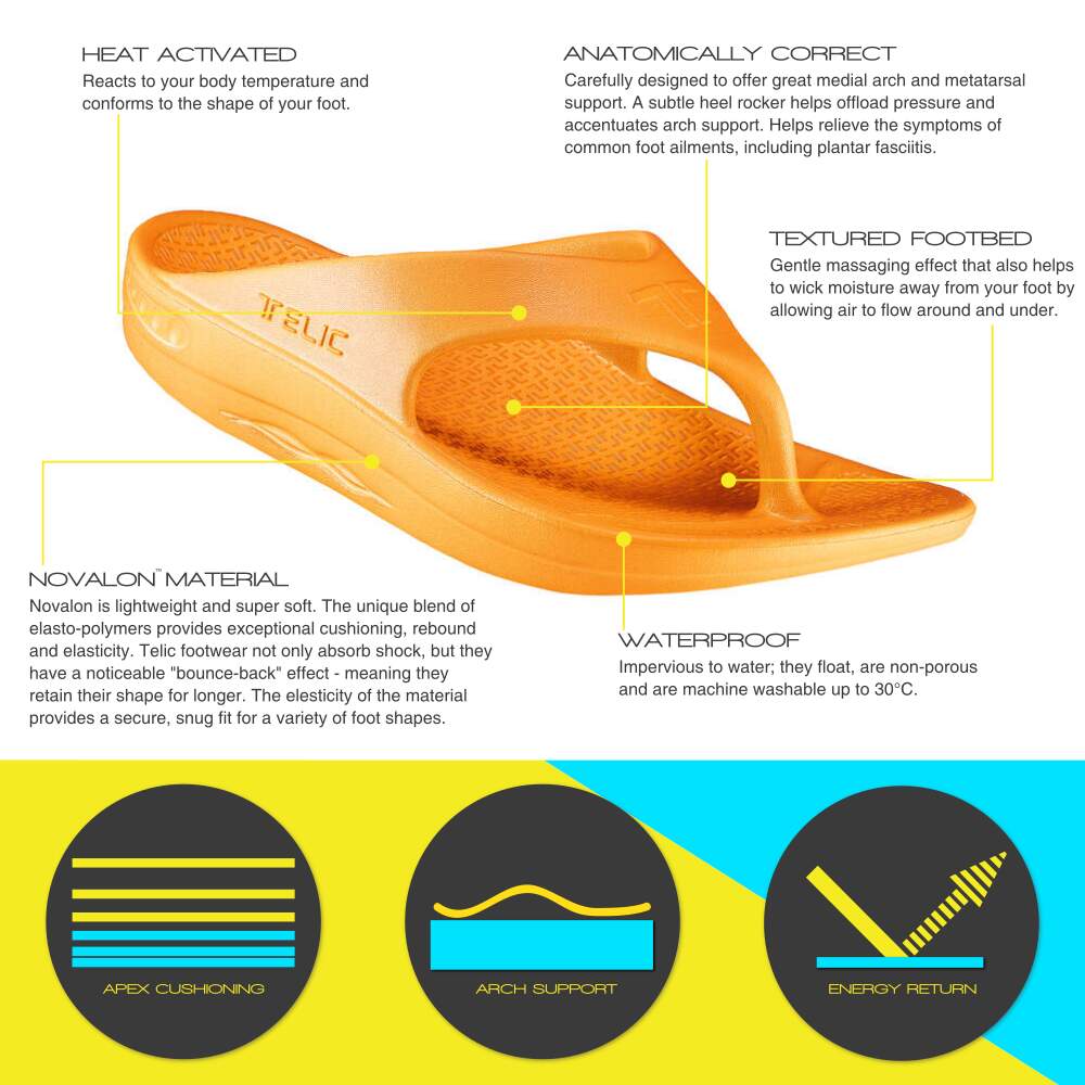 The Telic Energy Flip Flop is made entirely from Novalon, which is an unique blend of elasto-polymers. Designed to provide exceptional cushioning, rebound and elasticity. This means that these sandals not only absorb shocks while you are walking but also retains their shape for longer. So you don’t have to worry about them flattening out through use.