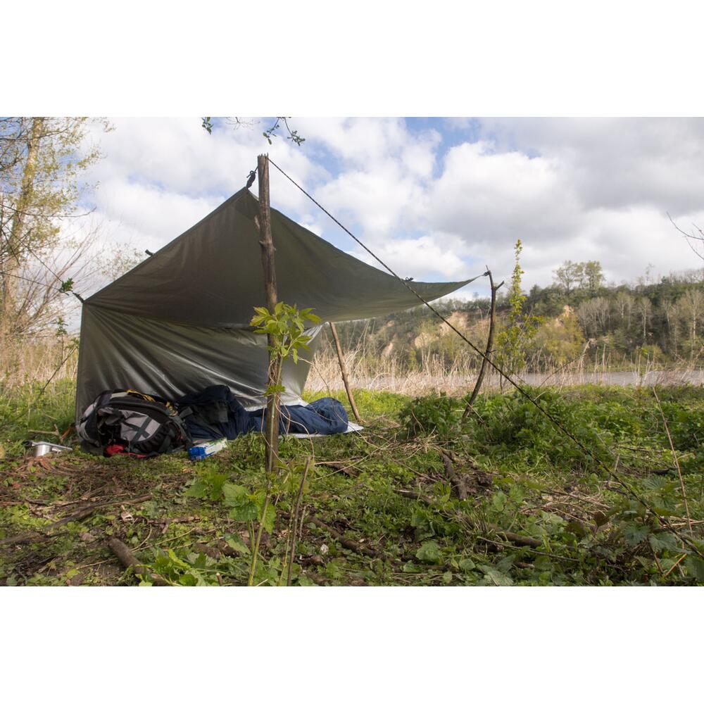 This Thermo Tarp is is also coated with a thermal insulation layer for added thermal comfort. The silver coating perfectly reflects the body heat, which helps keep you comfortable during cold nights. On hot days it reflects sunlight, significantly lowering the temperature under the tarp.